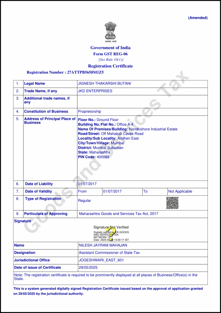 JKD Enterprises is a legally registered business under the Goods and Services Tax (GST),