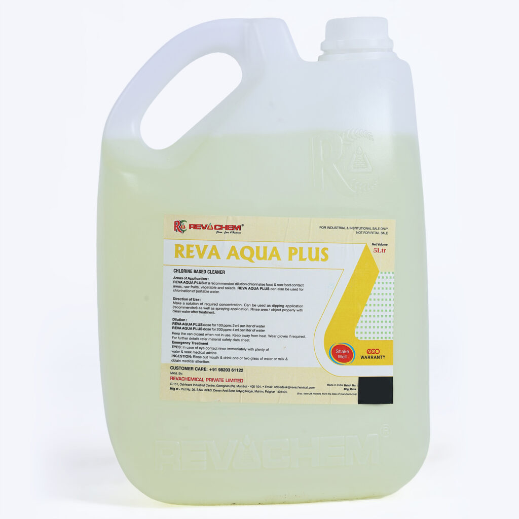 Introducing Reva Aqua Plus, a powerful chlorine-based sanitizer specifically designed for food and equipment sanitation. Ideal for use in food processing units, kitchens, and other hygiene-critical environments, Reva Aqua Plus ensures thorough disinfection, effectively eliminating harmful bacteria, viruses, and pathogens.